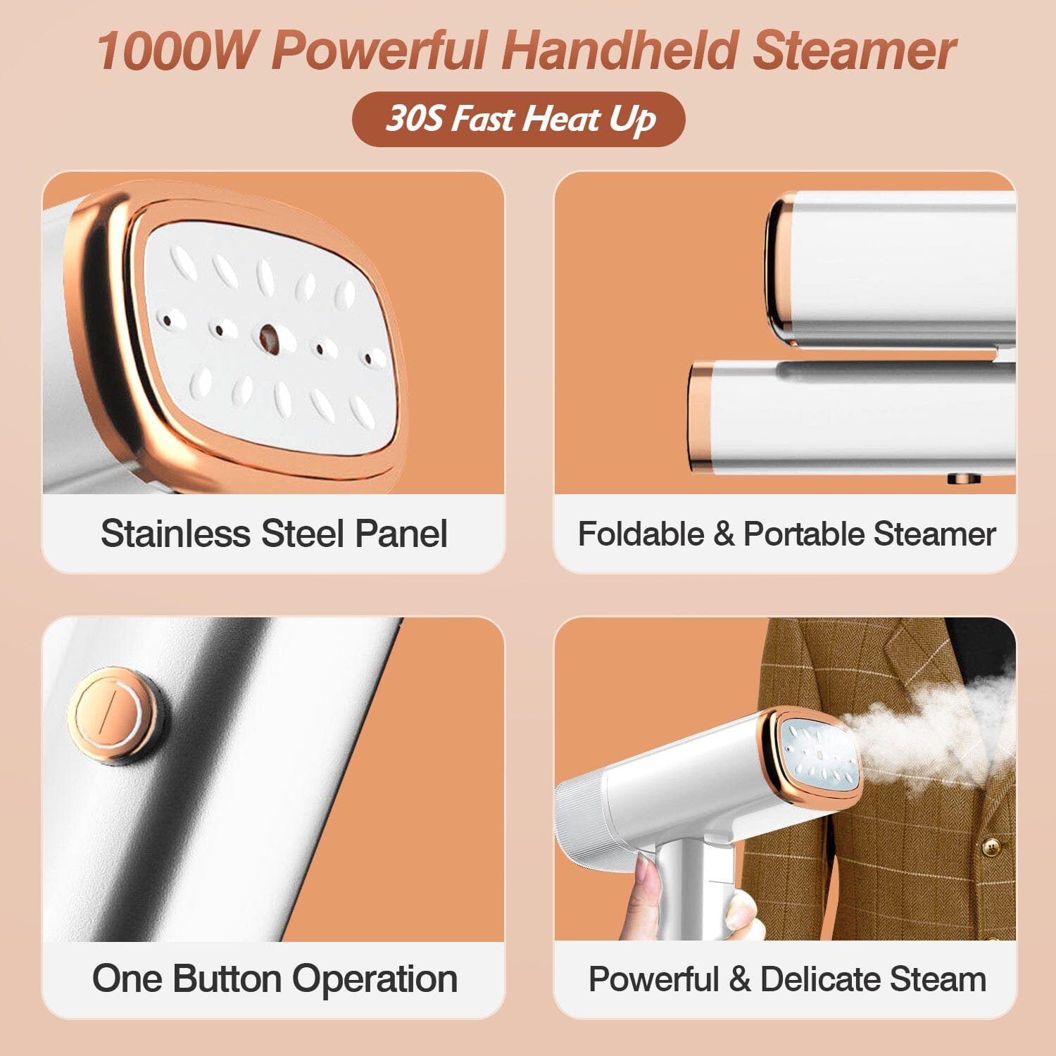 - 30s Fast Heating: Our 1000W handheld steamer only needs 30 seconds short heat-up time. provide powerful and delicate output steam to remove wrinkles and stubborn creases from your clothes rapidly and effectively.