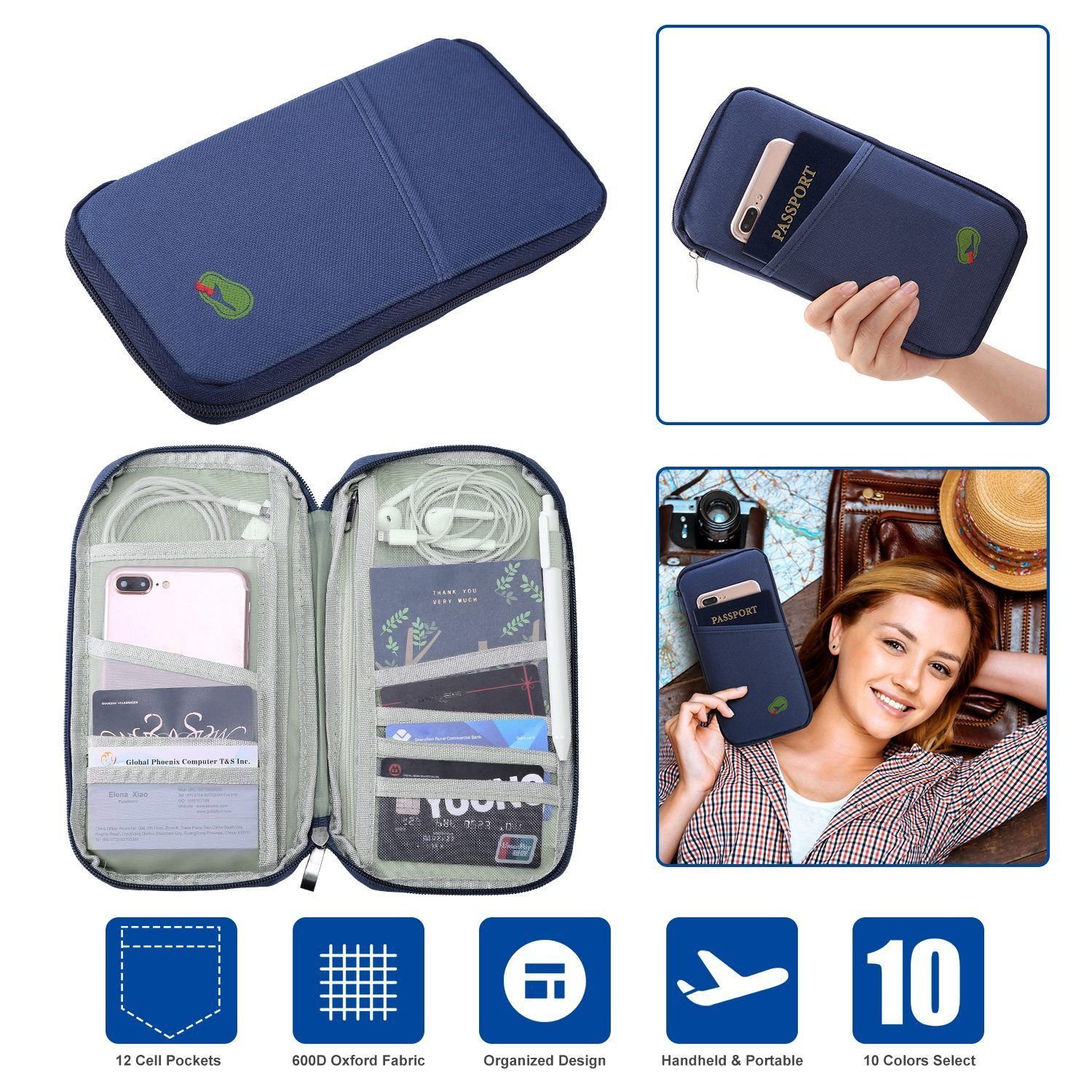 Are you still buried your head in hunting for your passports. airplane tickets. identification cards when you go aboard or pass the custom just turns to you? If you want to find your items quickly and accurately. our travel passport wallet is a travel must. Designed with 12 cell pockets and 1 pen collar clip with an overall zipper. to put your items in place and protect your personal information. Thoughtful outside storage cell (4.5 inches wide) to hold your phones (frequently use) and brings you much convenience. Compact size and handheld style enables it to be widely used in your trip or daily life.