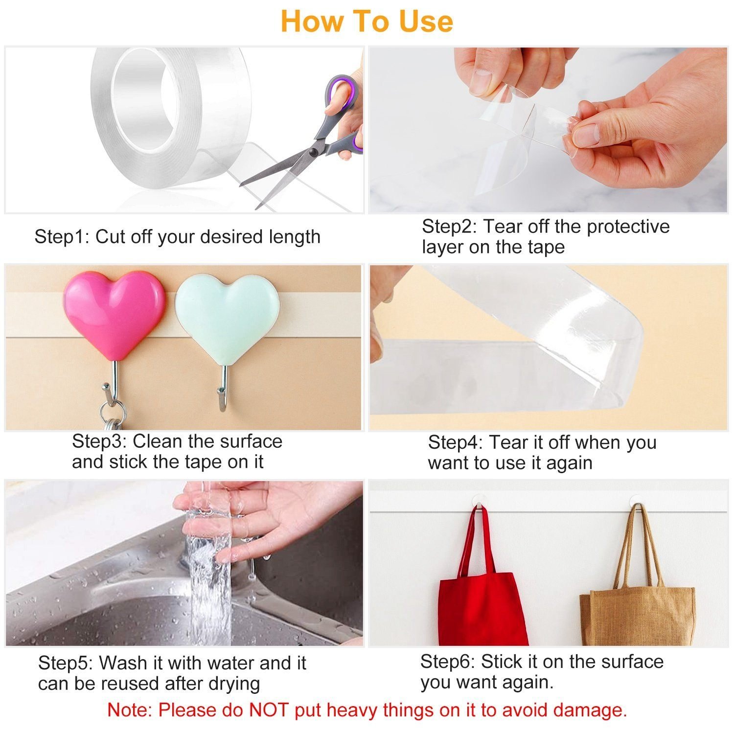 Made of unique Nano materials. our adhesive tape is suitable for almost any smooth and clean surface for sticking items. such as pasting photos. fixing carpet mats. etc.. With 16.4ft long tape. you can cut it to any size and length to meet your needs! After it gets dirty. you can wash it with water and dry it to regain the stickiness for reusing. Also no harm to the surface you stick to after peeling it off.