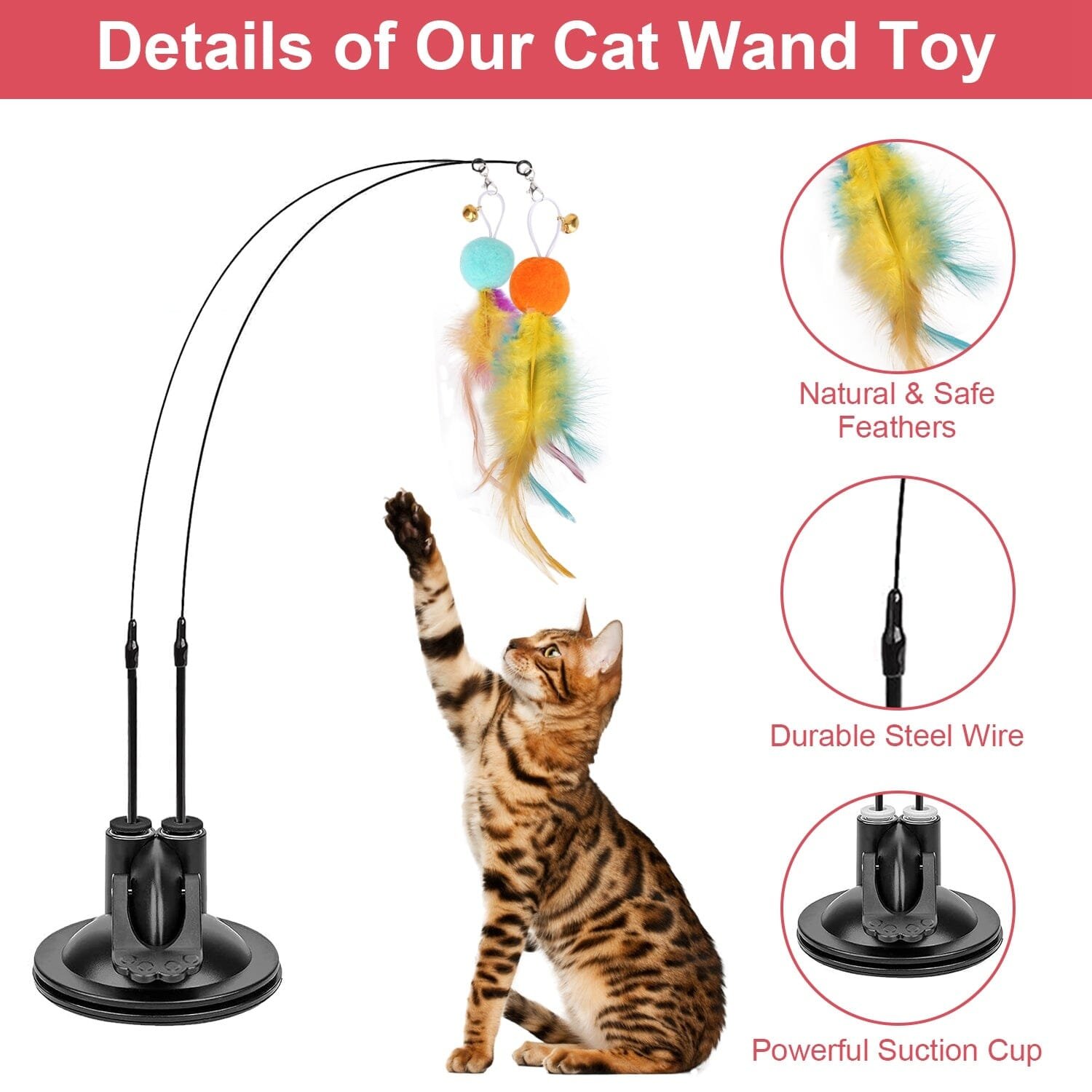 - 3 Interaction Modes: Come with 3 different interaction modes. you can stick the suction cup on the smooth surface or use the triangular clip to hang the toys. no cat can resist the temptation of wiggling toys. What’s more. you can also detach the cat wand to interact with your cats and promote the relationship between you and your cats.