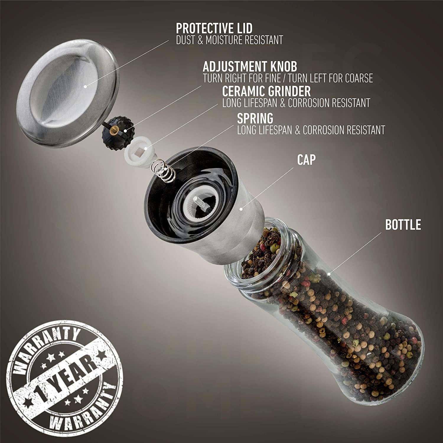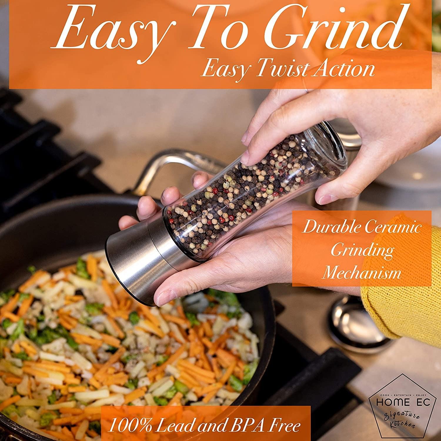 Home EC Salt and Pepper Mills are easy to grip and made of the highest grade non-corrosive. brushed Stainless Steel. and BPA Free glass bottle. This salt grinder and pepper grinder set is a modern. classy and user friendly addition to your kitchen. Perfect for a gourmet meal or dinner party. Great gift or party favor