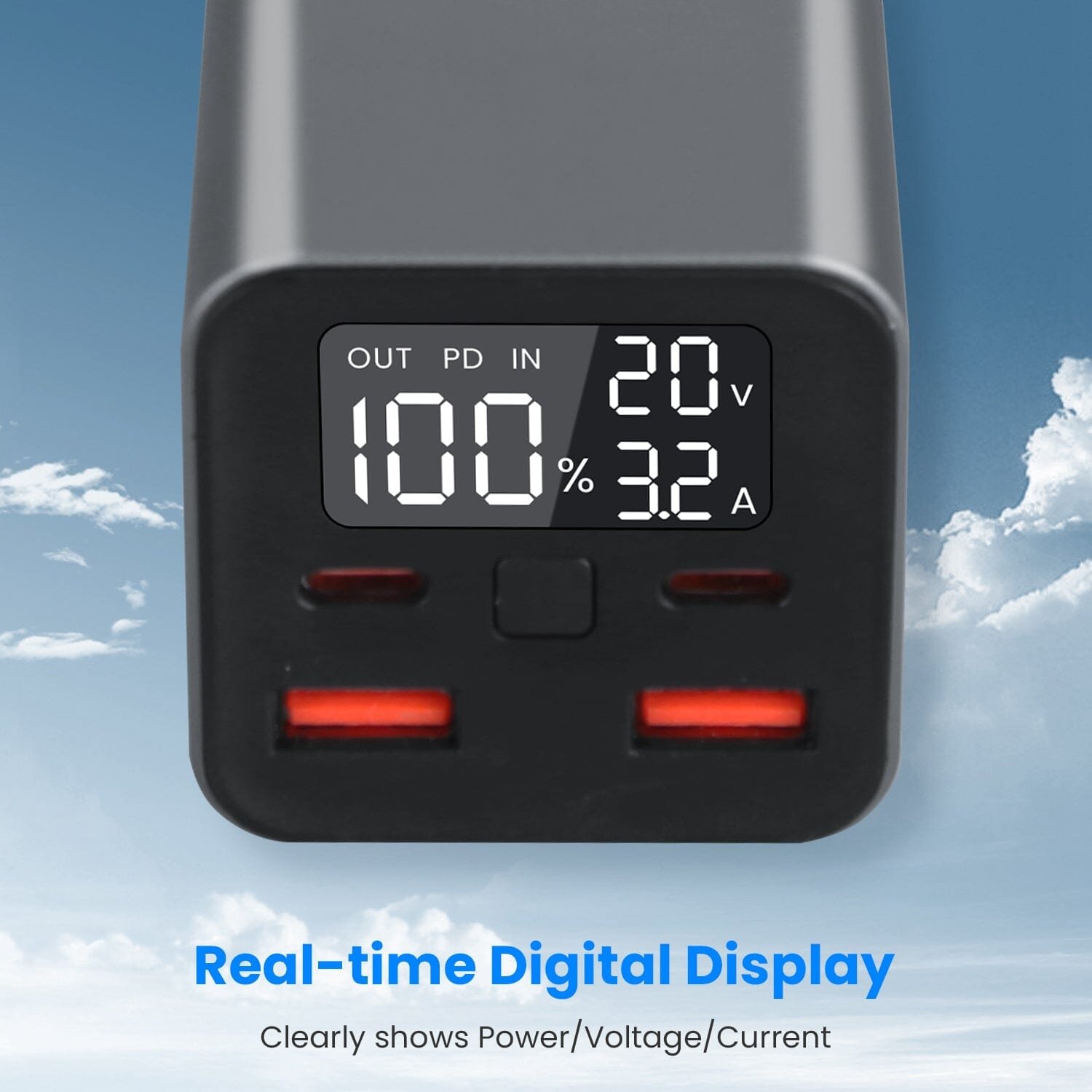 Step into the future of portable power with our 20000mAh 65W fast charging power bank. With super fast charging 2 USB outputs and 2 Type-C outputs. it delivers top-speed charging and enable you to fast charge 4 device simultaneously. Whether you’re charging your smartphone. tablet. or even a laptop. our 20000mAh power bank has got you covered with its powerful performance. Fit for MacBook Air/Pro. Chromebook. XPS. Latitude. Spectre. Folio. Thinkpad. Pixelbook. Surface Book. Yoga. Acer Spin. Switch Alpha. ASUS Transformer. Zenbook. LG Gram. iPad Air/Pro. Steam Deck. Gaming. and more. Also fit for most smartphones and tablets that confirmed to fast charging protocol. Clearly show the battery level. voltage and current in real time with the display screen. Only takes 2 hours for recharging with USB-C to USB-C cable. Offer multiple protections to ensure superior safety. Don’t settle for slow and inconvenient charging solutions??upgrade to our USB-C PD charger today. Compact and lightweight. Keep your devices charged no matter where life takes you.