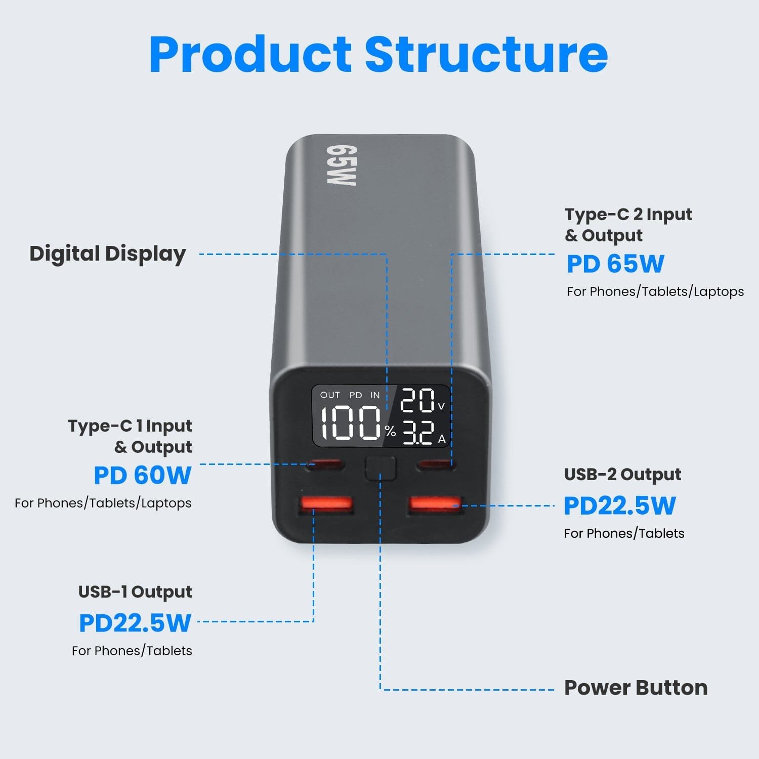 20000mah 65W USB-C PD Laptop Power Bank Fast Charging