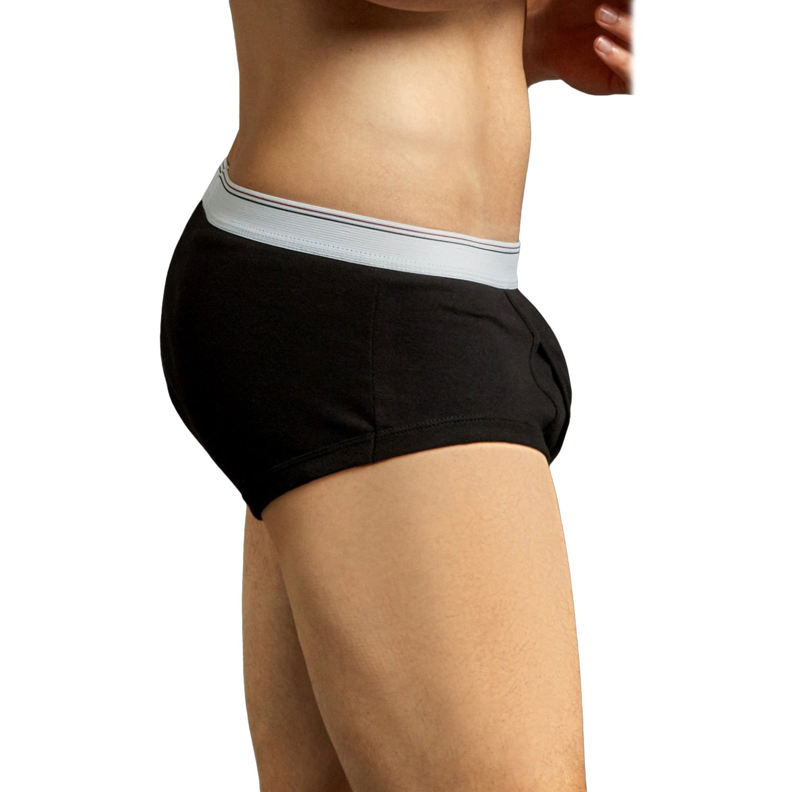 - Solid or Striped Prints. Support pouch. Top Pro Thich Waistband. Pull On Closure. Fly Open. Bikini brief style. Stretchy material.