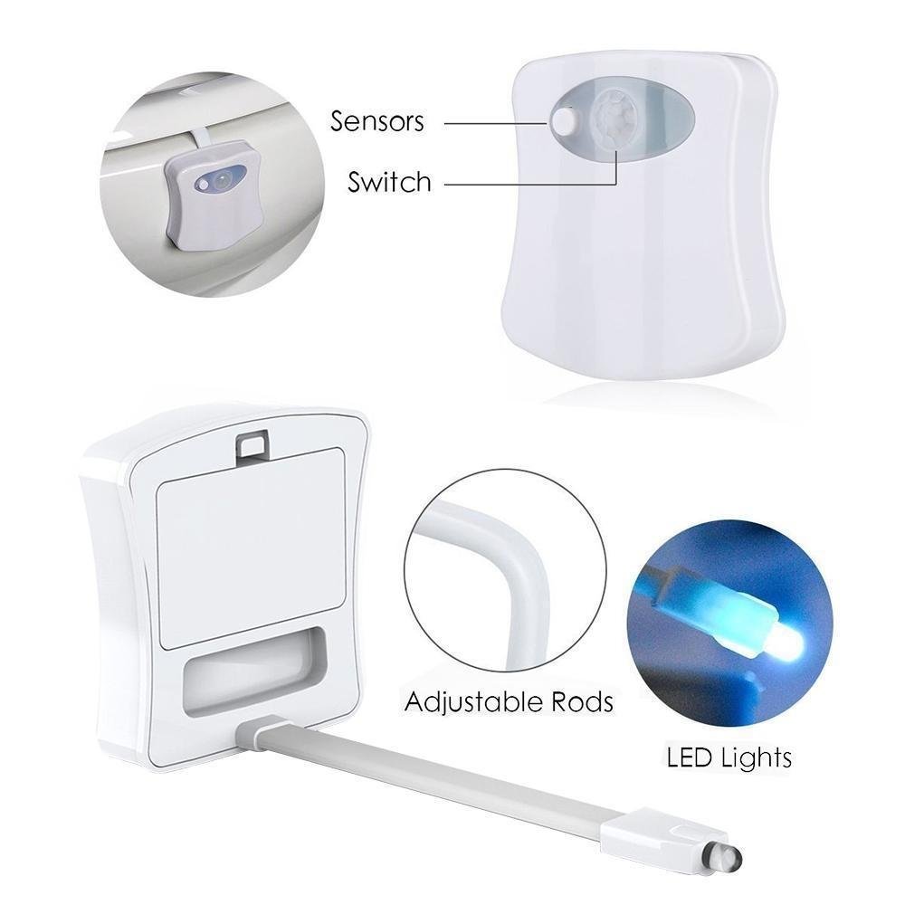 We all know the dilemma: you wake up in the middle of the night and have to go to the bathroom. Either you turn the light on and get attacked by harsh brightness that hurts your sleepy eyes. or take the risk and leave the lights off–only to inevitably stumble into something. But what if we told you there’s a way to nix both of those options? The 8-Color LED Sensor Motion-Activated Bathroom Toilet Light will handle it! This awesome device features a motion detector that turns LED lights on in your toilet when you walk into the bathroom. and can cycle between 8 different colors. Then. the energy-efficient detectors turn the light off when you leave the bathroom.