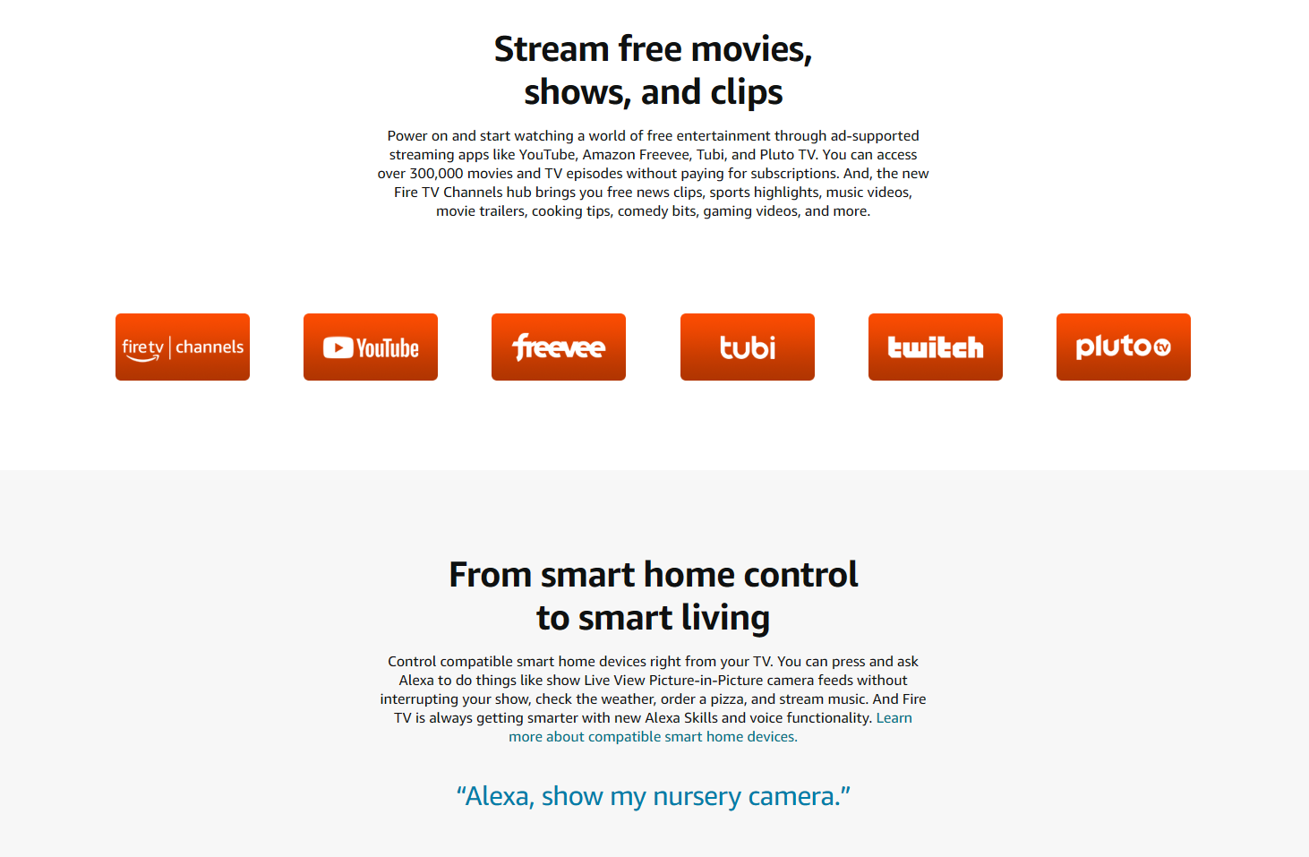 - Stream for free – Access over 300,000 free movies and TV episodes from popular ad-supported streaming apps like Fire TV Channels, Amazon Freevee, Tubi, and Pluto TV.