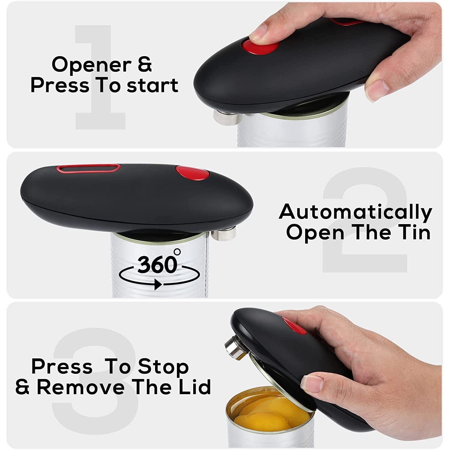 - ONE-TOUCH OPERATION – FAVIA electric can opener is a hands-free kitchen gadget that opens any can without effort. Just press the button to start. rotate around the lid about 360??. and press the button again to stop.