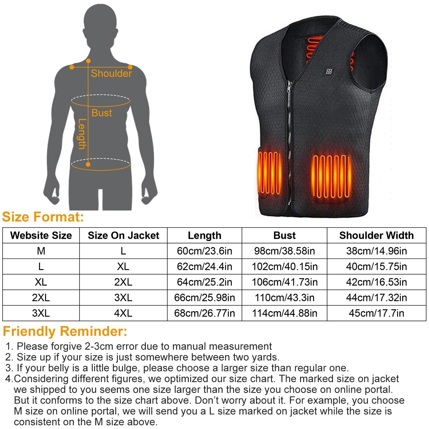 - USB Port Heating Vest: Come with USB cable. it is better for you to carry a power bank (5V/2.1A max output). Zipper design is quick to wear and hand pocket to accommodate your power bank (Power bank not included).