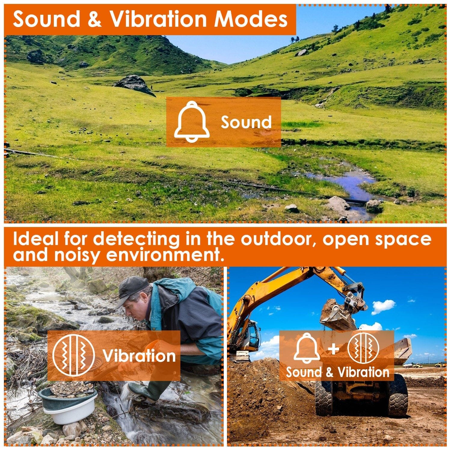 - Sound & Vibration Modes: Featured with sound mode. vibration mode. ideal for detecting in the outdoor. open space and noisy environment. And LED lighting allows you to detect in dim night.