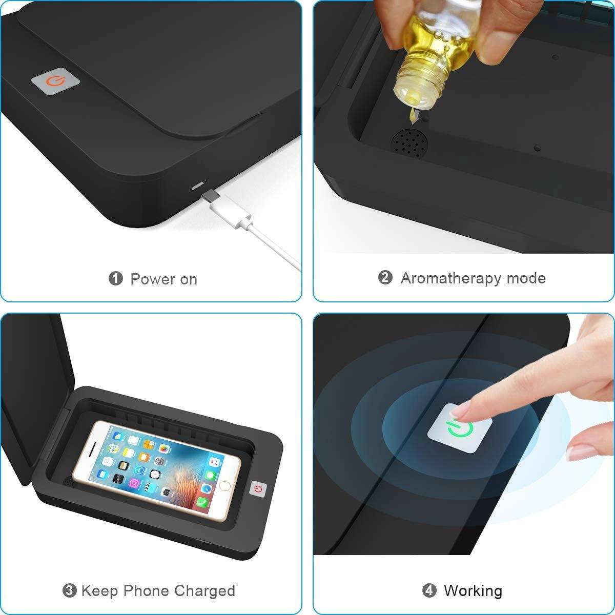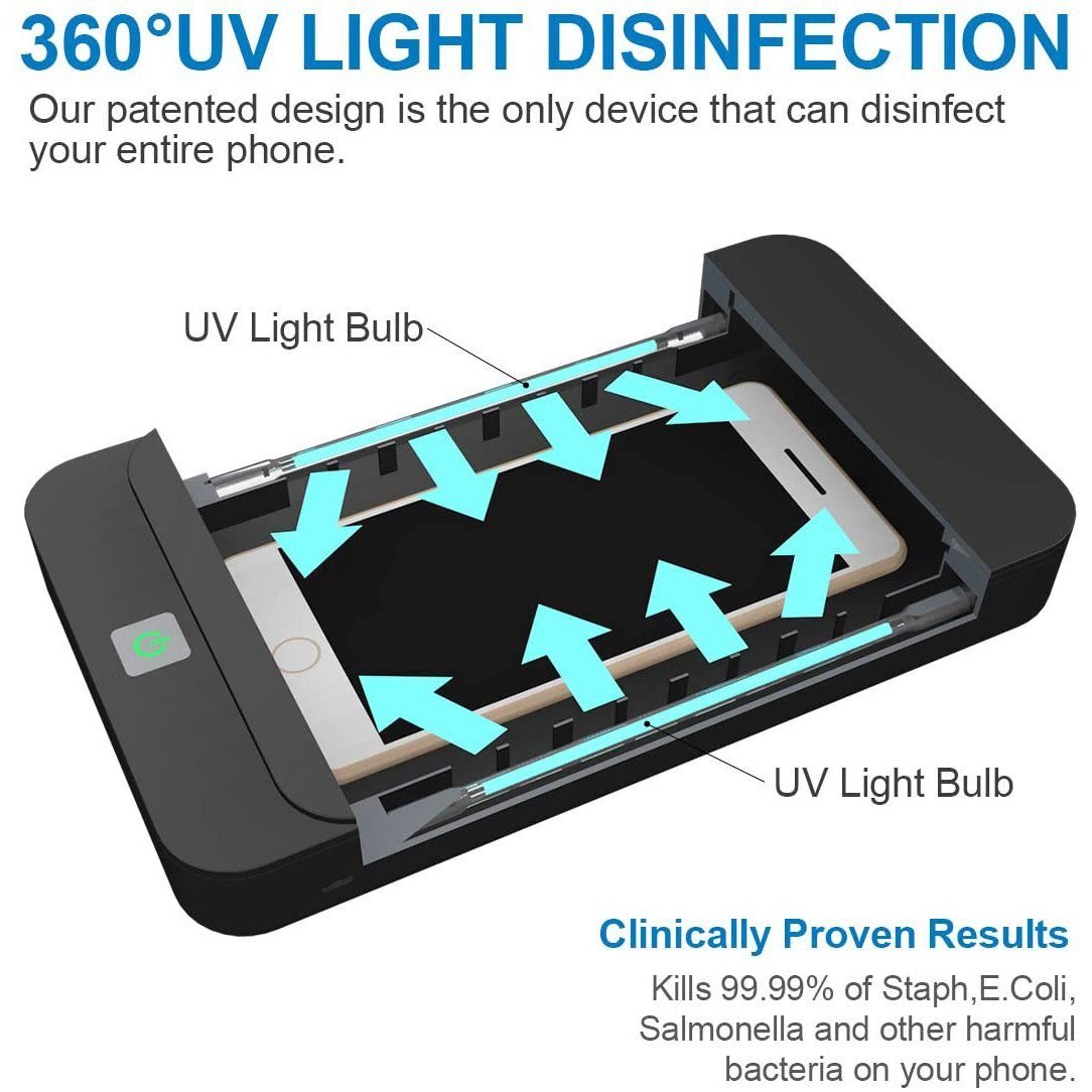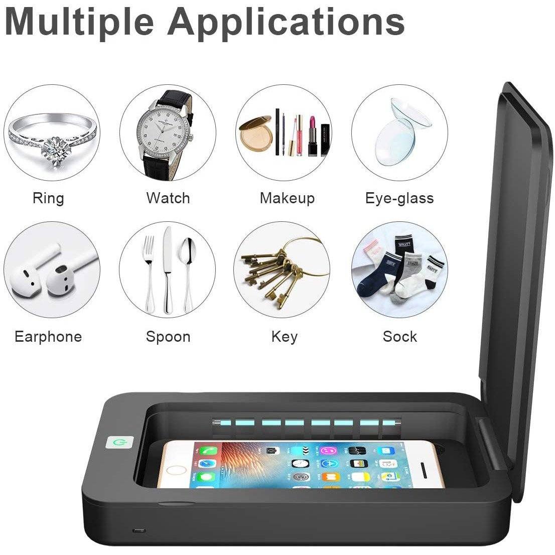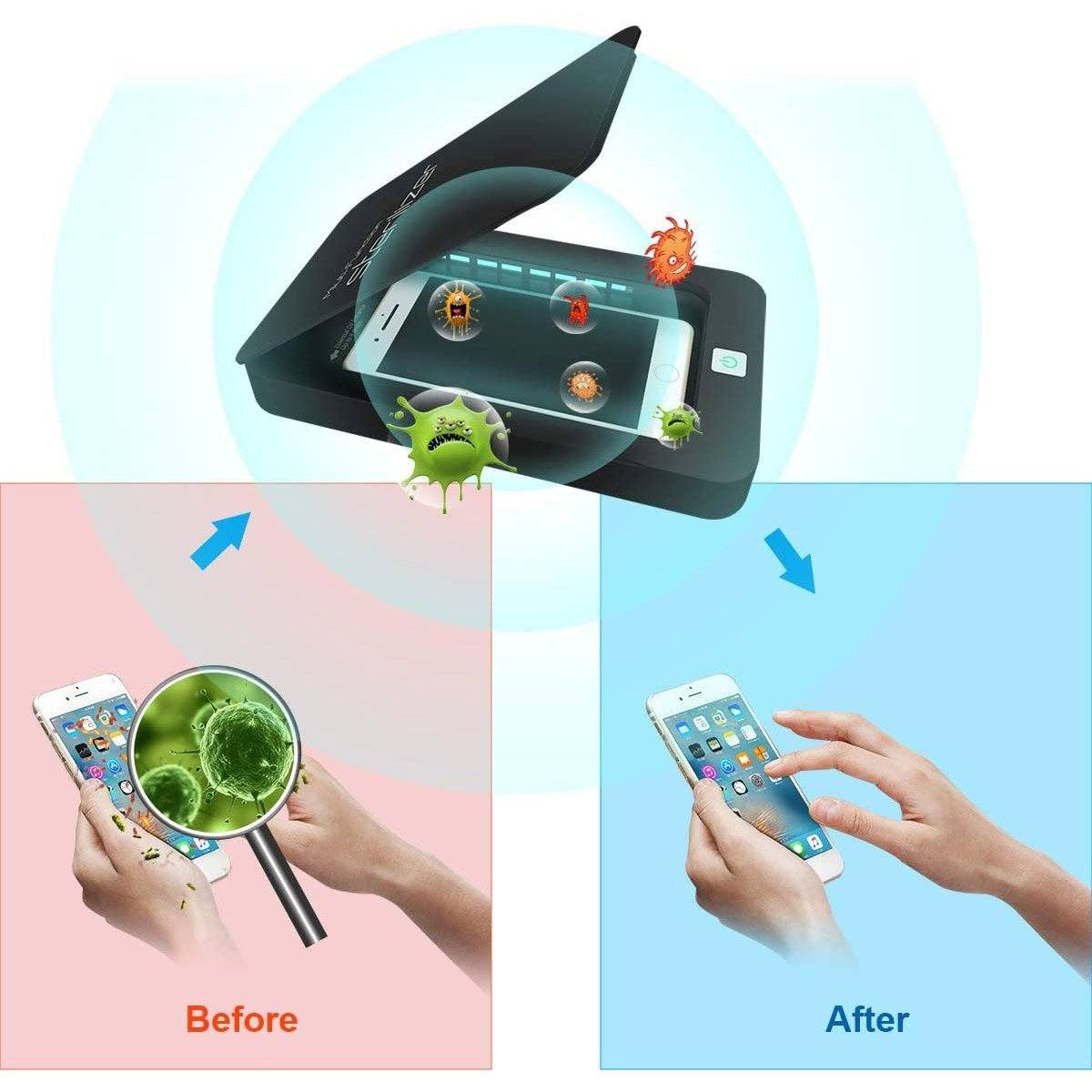 - Portable: The sleek. ergonomic and compact design makes it easy to take with you. wherever you go. Especially this black phone disinfector is powered from laptop desktop power bank USB charger. you can use with this case whether at work home traveling or car.
