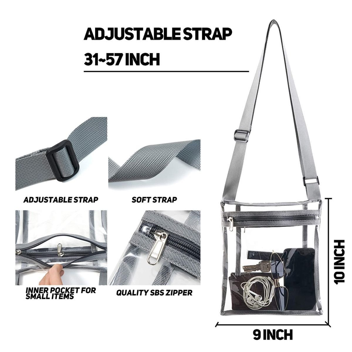 - This clear bag is made of PVC with an adjustable strap and deep inner pockets to keep your useful items safe and visible enough for safe passage.