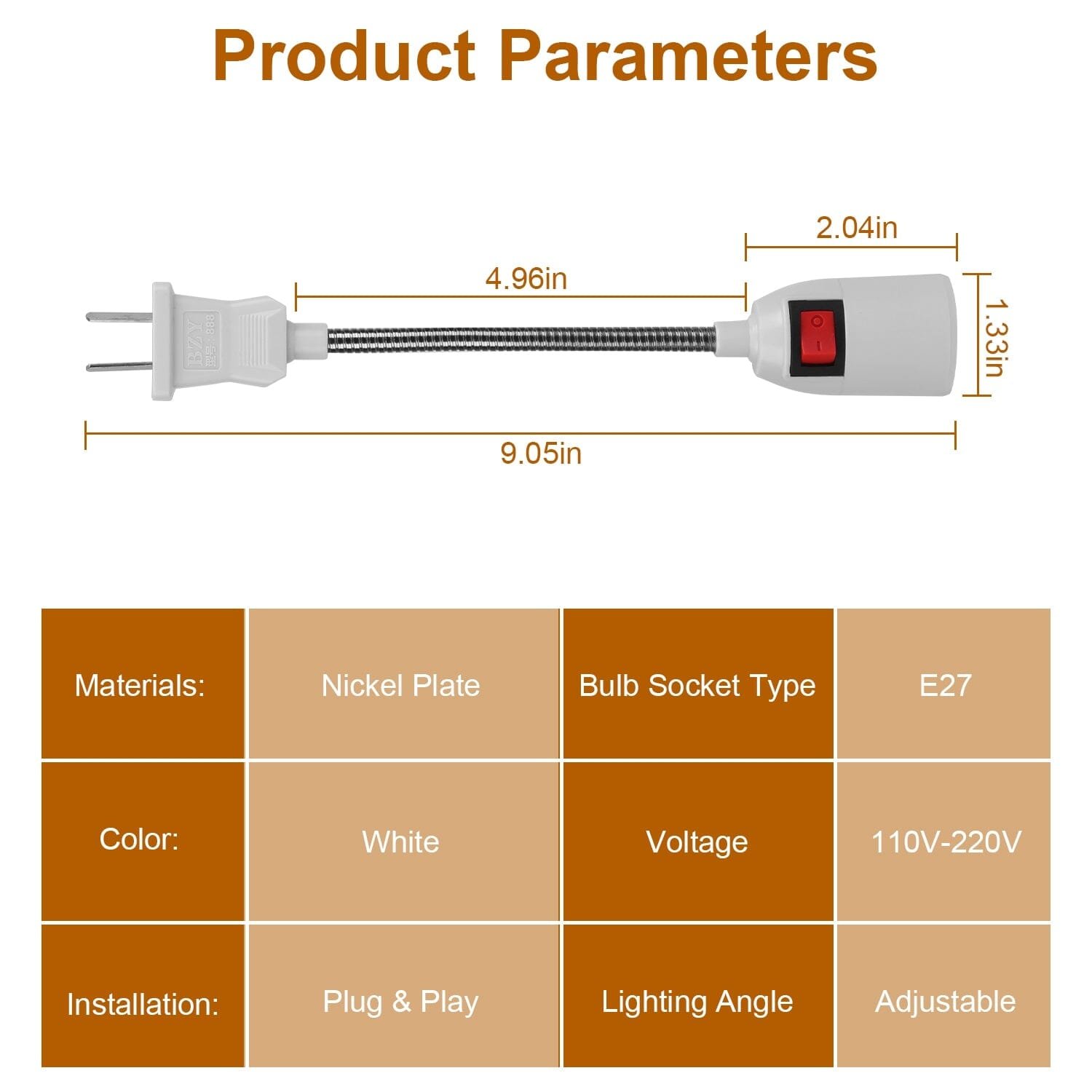 E27 socket has good compatibility with your existing fixtures. a great replacement for your broken one. Come with bright color I/O switch. easy to control the on/off of light and camera. PC retardant materials bring you much safety. Plug and play. no other tools needed. Flexible goose neck enables you to position any angle you want. Ideal for home light fixture. plant grow light. basement. door light bulbs. showcase lighting and fish tank light.
