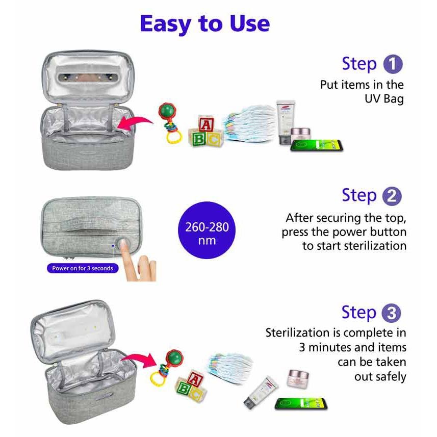 UV light has long been used for eliminating germs and bacteria by effectively destroying their DNA & RNA. It has been widely used in the medical field with its high disinfection rate and is very effective against bacteria which causes other illnesses like colds. The Diamond UV Light Sanitizing Foldable Bag is a 100% clean and energy efficient way to sterilize any object. This specially designed UV sterilizing bag sanitizes all of your personal accessories. clothes. wallets. keys. facemasks. smartphones. small computer peripherals. baby bottles. etc. in as little as 5 minutes.